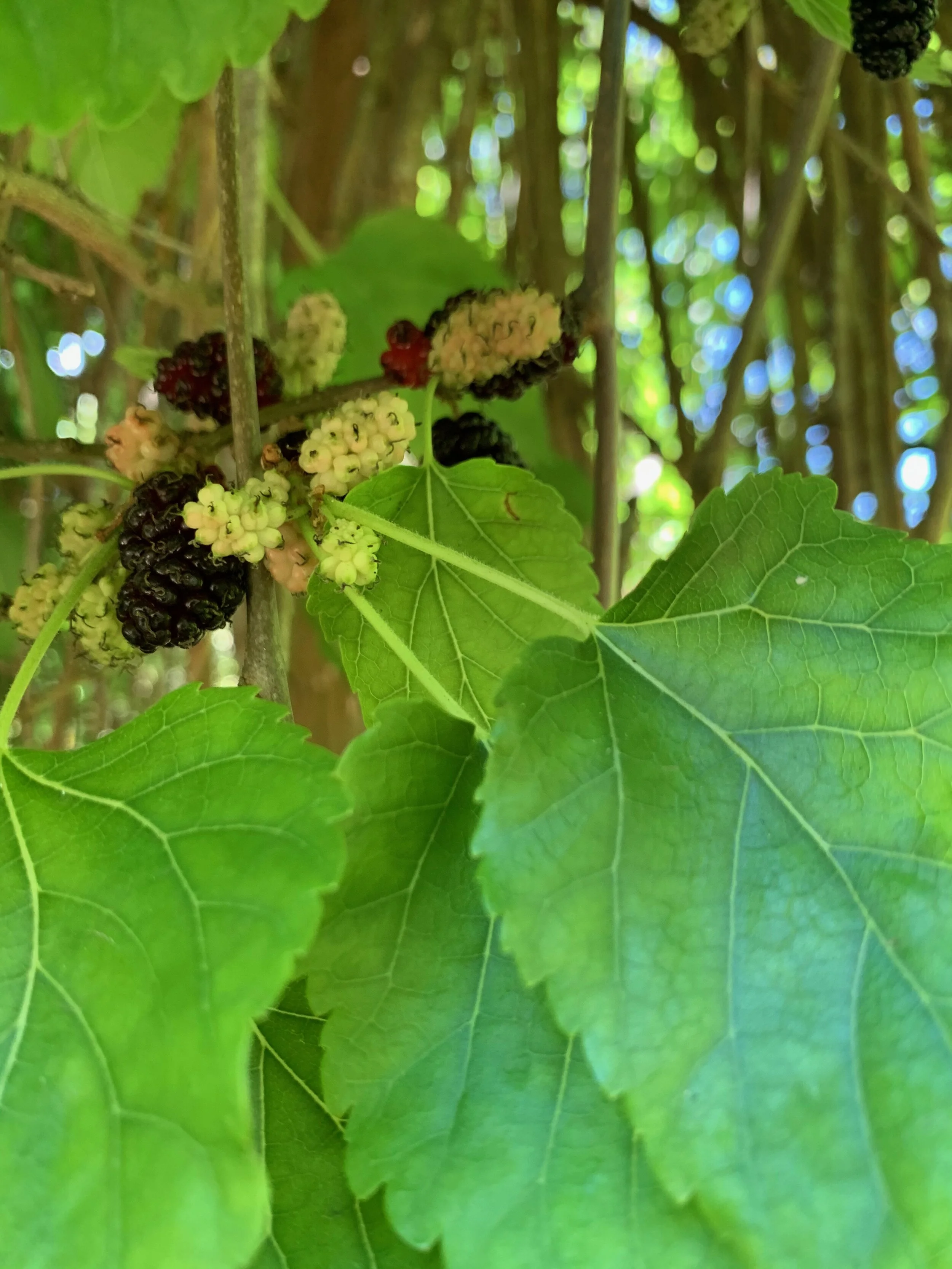 My mulberry trees have been my place of refuge. From May through July, I work three different harvest cycles, twice a day, bringing in feasts of purple, black and red. Each tree is a therapy pal, whose leaves listen to my every thought. I meld into their branches, and shift my weight onto their limbs. I approach sometimes needing a break from the endless back-to-back Zoom meetings, needing sunlight and fresh air. Other times with a sense of duty not to let this gift from the heavens go to waste. I fill my empty bowls with the jewels of nature’s invisible workings. I return always with a feeling of abundance, of having encountered the precious, and connected with the earth. What have I done to deserve this bounty?